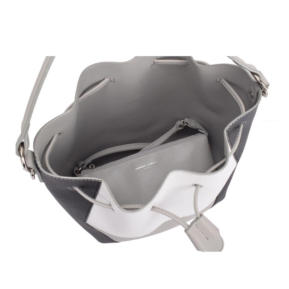 Made from cow leather. Smooth tri-color leather bag with handle. Includes adjustable cross body/ shoulder strap. Main compartment with leather string closure. Silver metal detailing. Interior: Removable pouch. Dust bag.