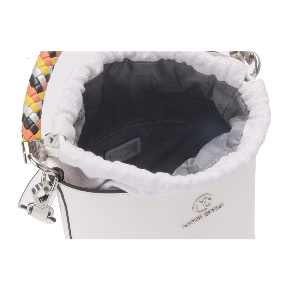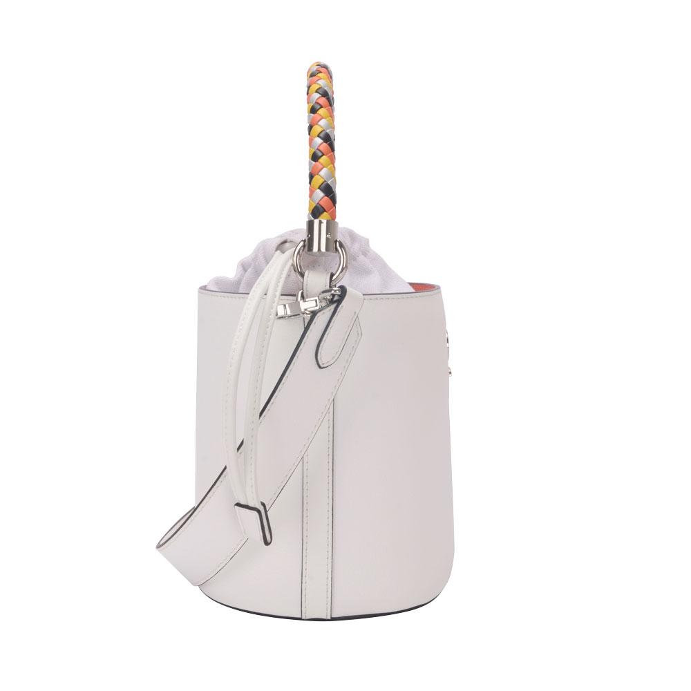 Made from cow leather. Smooth leather bag with multicolored woven leather handle. Includes adjustable cross body/ shoulder strap. Main compartment with leather string closure. Silver metal detailing. Interior: Slip pocket. Zip slip pocket. Dust bag.